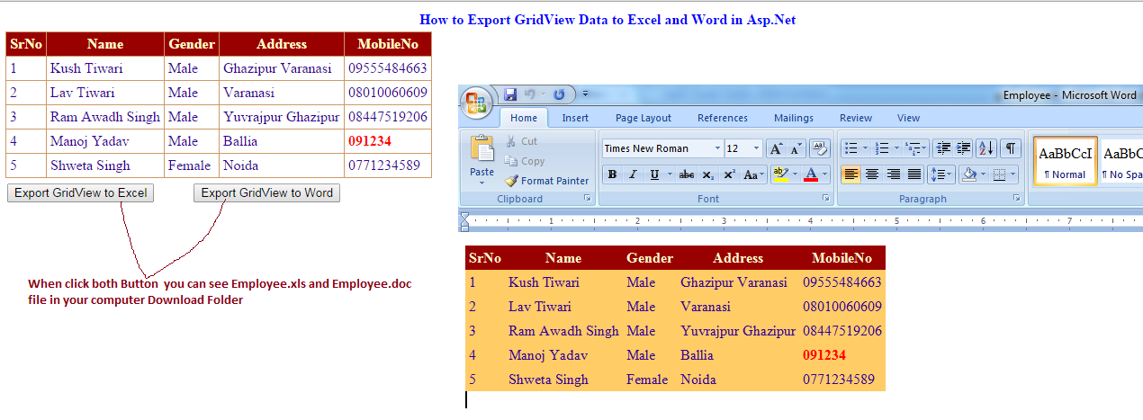 Export GridView Data to Excel and Word in Asp.Net</center></b></font> </td>